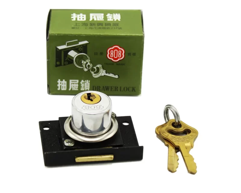 قفل کمد 808، دارای بدنهای از جنس آهن و مقاوم می باشد.ابعاد این محصول 5*4.5 سانتیمتر و وزن آن 84 گرم است. هنگام خرید قفل کمد، توجه به نکاتی مانند نوع کلید، تعداد پلهها (یک یا دو پله) و نوع زبانه (کوتاه یا بلند) اهمیت زیادی دارد.